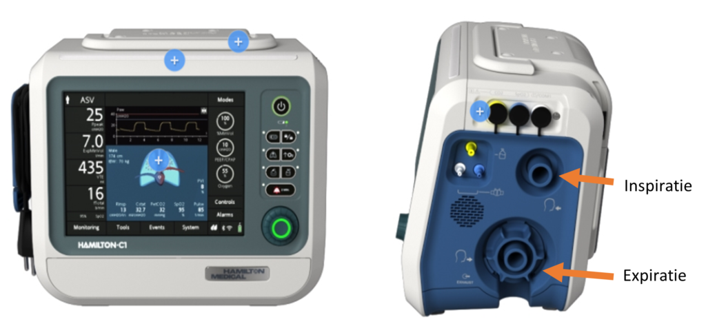 De Hamilton C1 machine gebruiken we op 4 kamers. Deze machine kan gebruikt worden voor zowel gecontroleerde beademing als NIV en Hiflow. Deze machine bevat een turbine, waardoor een persluchtaansluiting vervalt. Hierbij hoeft alleen zuurstof aangesloten te worden. De machine genereert zelf de perslucht.