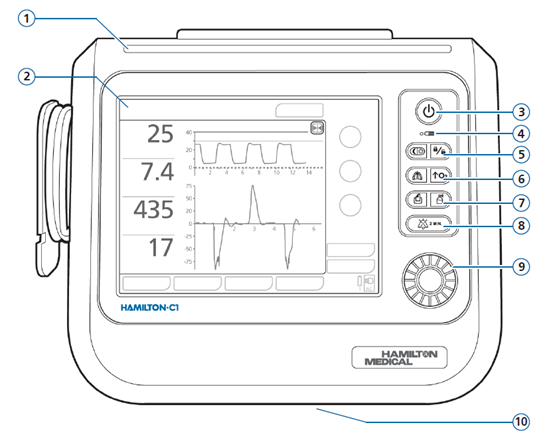 De lay-out van het scherm van de Hamilton C1 en MR1 komt overeen en alle knoppen zijn hetzelfde.