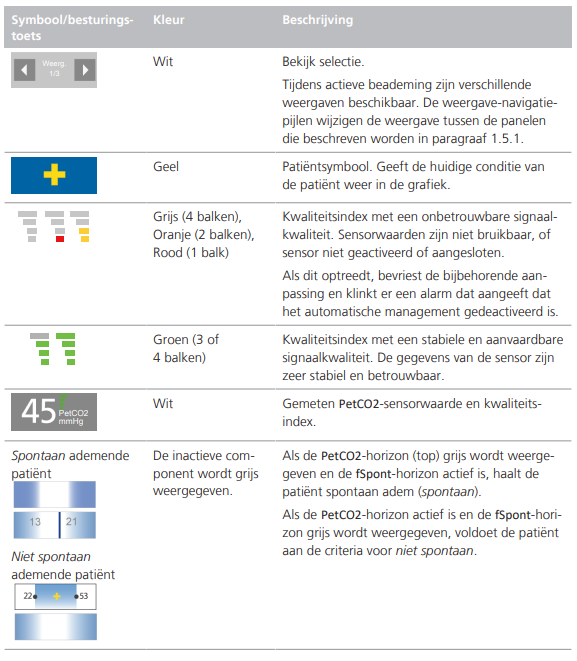 Targetgebied van PetCO2 (zie verderop in de reader) verschuift naar rechts. Targetgebied van SpO2 (zie verderop in de reader) verandert van vorm, verschuift naar links. Check altijd of dit terecht is voor deze patiënt. Niet iedere patiënt met deze conditie heeft immers ook chronische hypoxemie.